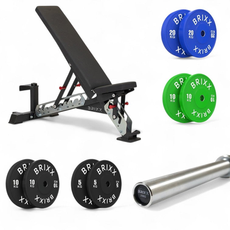 Featuring our greatest-ever bench, the Everest Commercial Bench, crafted from ultra-strong steel and paired with a premium-grade Olympic barbell, precision barbell collars, and your choice of bumper plates. Choose the Elite Colour Bumper Plates for a bold, professional finish, or the Classic Black Bumper Plates for a clean, timeless aesthetic.